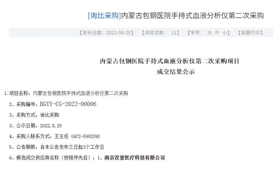 南京漢譽醫(yī)療近期就以雅培手持式血氣分析儀中標了內(nèi)蒙古包鋼醫(yī)院手持式血液分析儀招標采購項目。