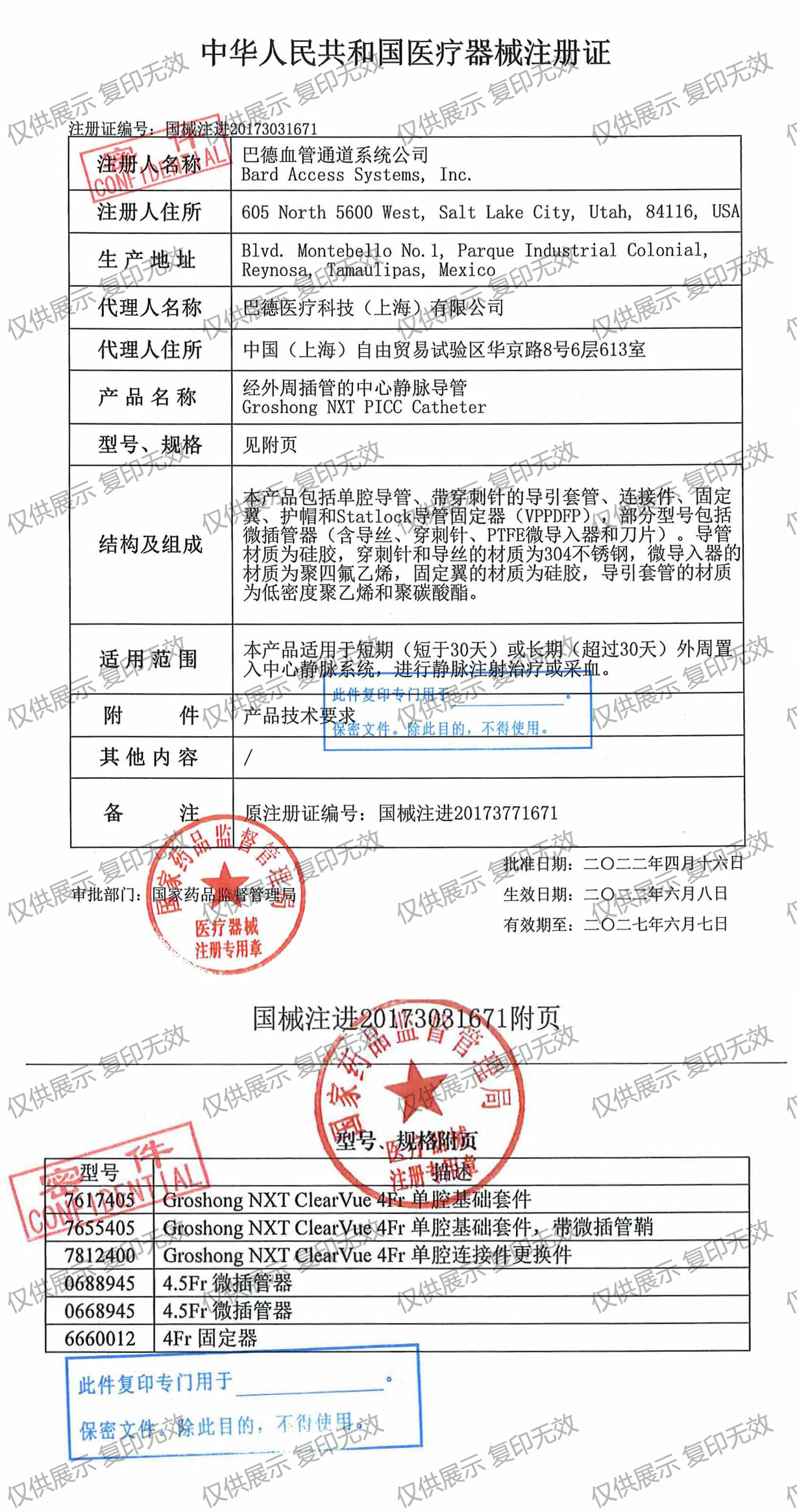 適用范圍:本產(chǎn)品適用于短期(短于30天)或長(zhǎng)期(超過30天)外周置入中心靜脈系統(tǒng),進(jìn)行靜脈注射治療或采血。