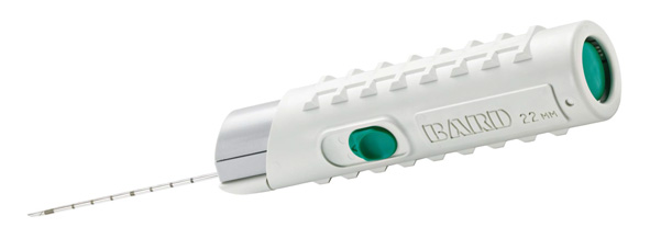 結(jié)構(gòu)及組成:一次性活檢針由手柄和活檢針組成,手柄由樹脂和熱塑性彈性體構(gòu)成,活檢針由304不銹鋼穿刺針和同心套管組成。套管上有厘米刻度標(biāo)識(shí)。手柄旁側(cè)和后部的傳動(dòng)按鈕按照不同的規(guī)格大小用不同顏色標(biāo)出:黃色=20G、粉紅色=18G、紫色=16G、綠色=14G。