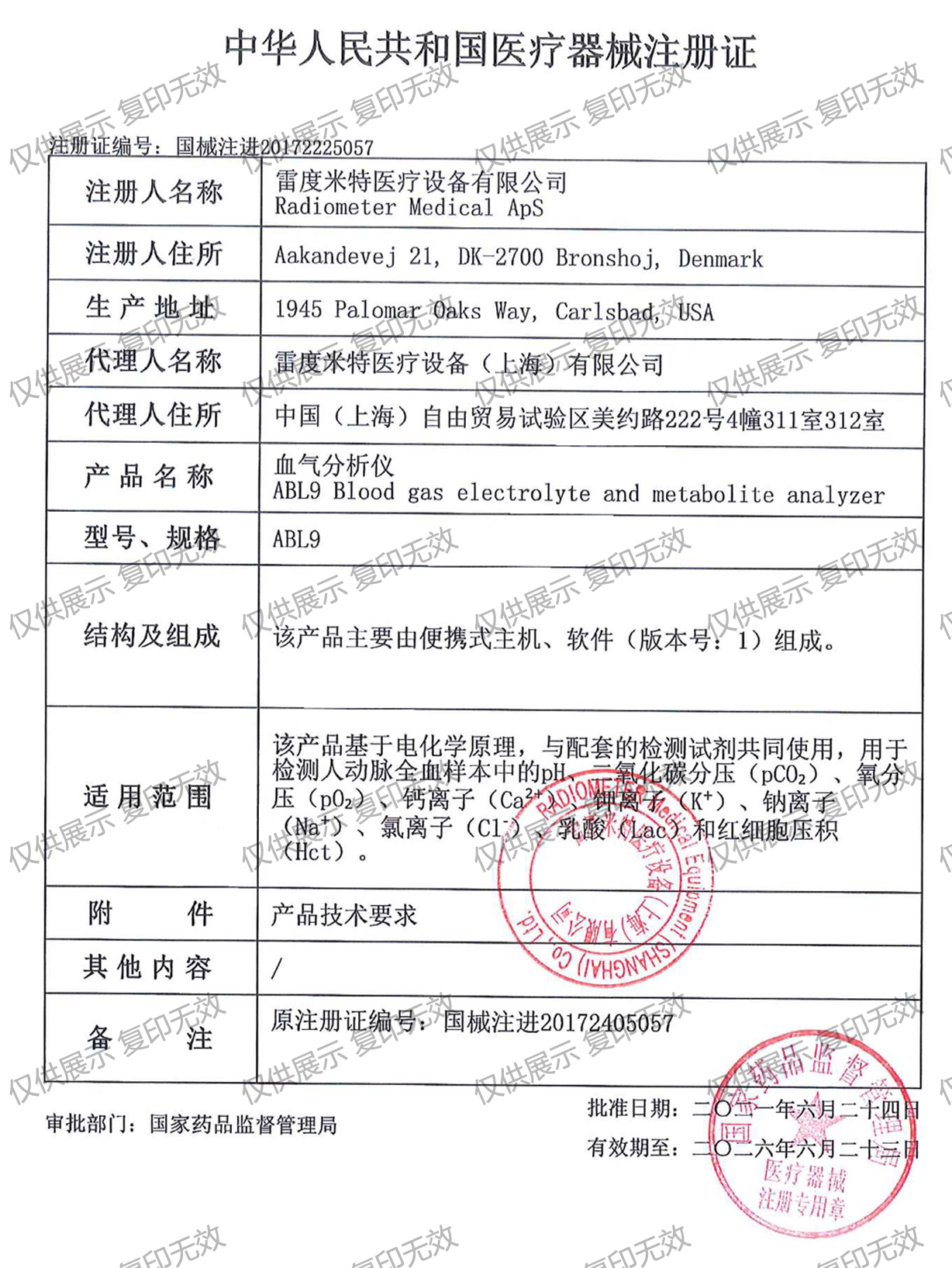 適用范圍/預(yù)期用途:該產(chǎn)品基于電化學(xué)原理,與配套的檢測試劑共同使用,用于檢測人動脈全血樣本中的pH、二氧化碳分壓(pCO2)、氧分壓(pO2)、鈣離子(Ca2+)、鉀離子(K+)、鈉離子(Na+)、氯離子(Cl-)、乳酸(Lac)和紅細(xì)胞壓積(Hct)。