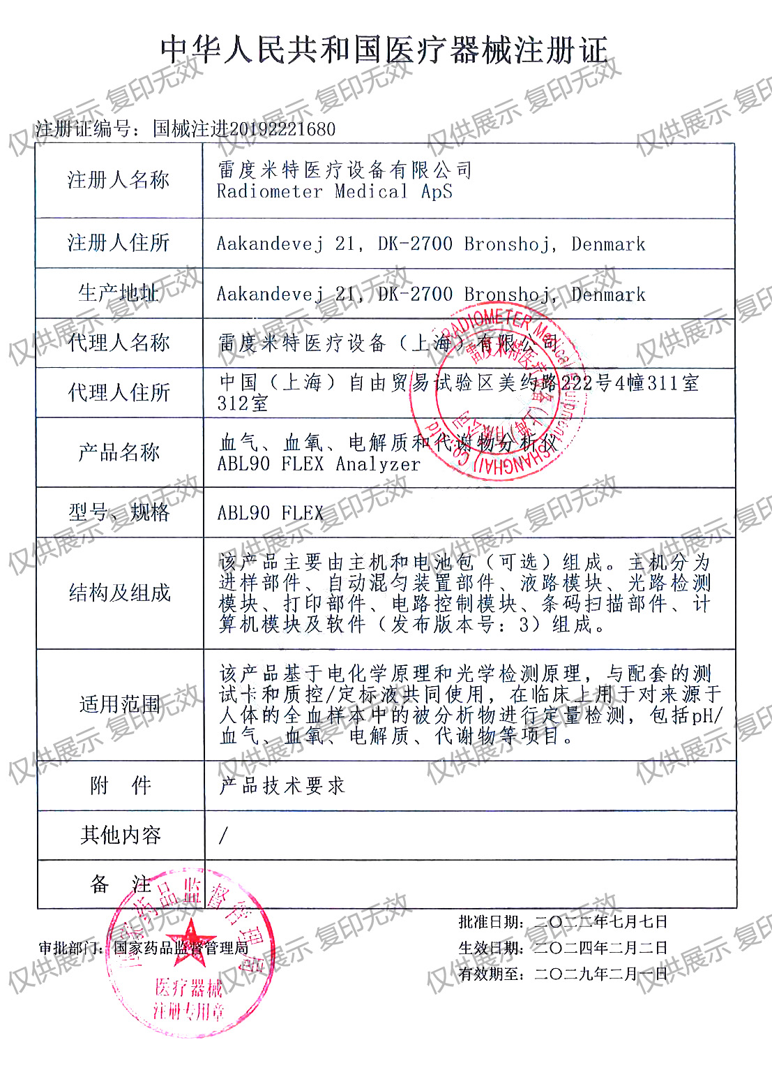 適用范圍/預(yù)期用途:該產(chǎn)品基于電化學(xué)原理和光學(xué)檢測(cè)原理,與配套的測(cè)試卡和質(zhì)控/定標(biāo)液共同使用,在臨床上用于對(duì)來源于人體的全血樣本中的被分析物進(jìn)行定量檢測(cè),包括pH/血?dú)狻⒀?、電解質(zhì)、代謝物等項(xiàng)目。