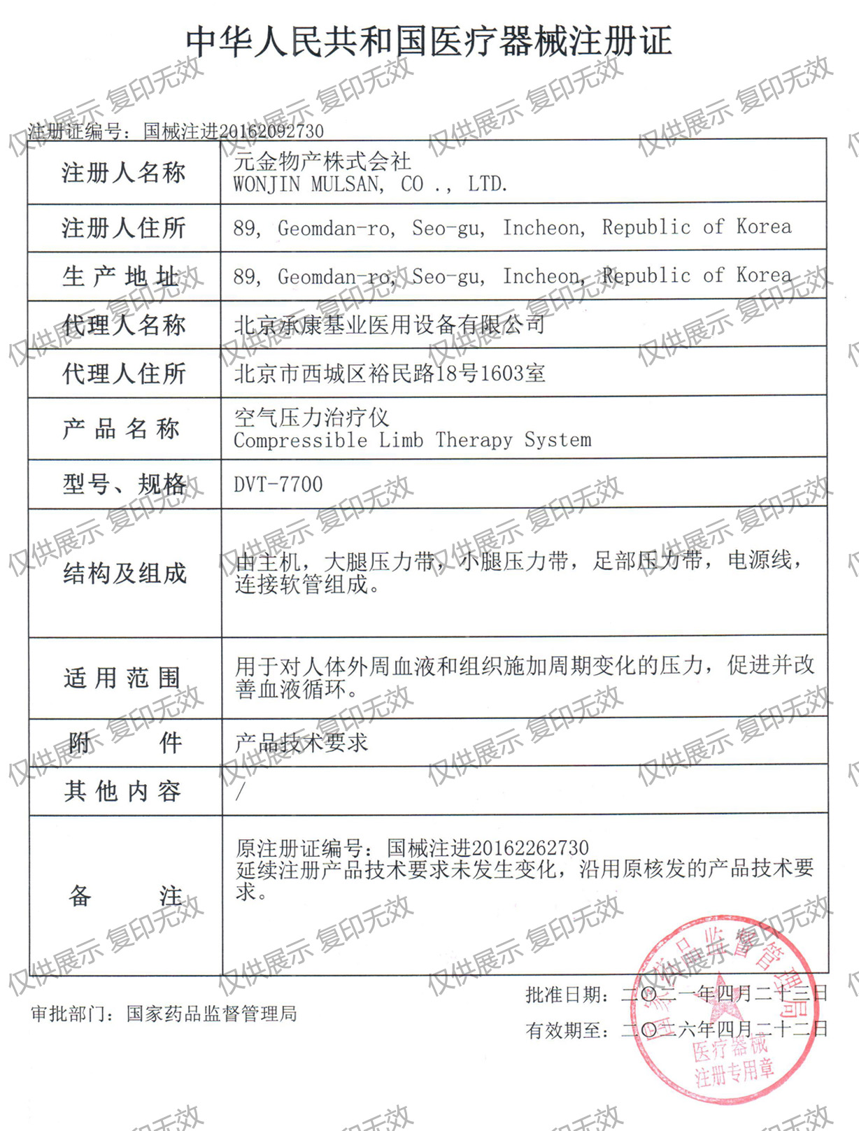 適用范圍:用于對(duì)人體外周血液和組織施加周期變化的壓力,促*并改*血液循環(huán)。