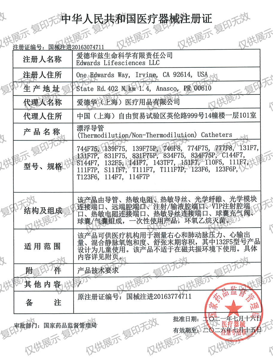 適用范圍:該產(chǎn)品可供醫(yī)療機構(gòu)用于測量右心和肺動脈壓力、心輸出量、混合靜脈氧飽和度、舒張末期容積,其中132F5型號產(chǎn)品設(shè)計為兒童使用。該產(chǎn)品不適于在磁共振環(huán)境下使用。