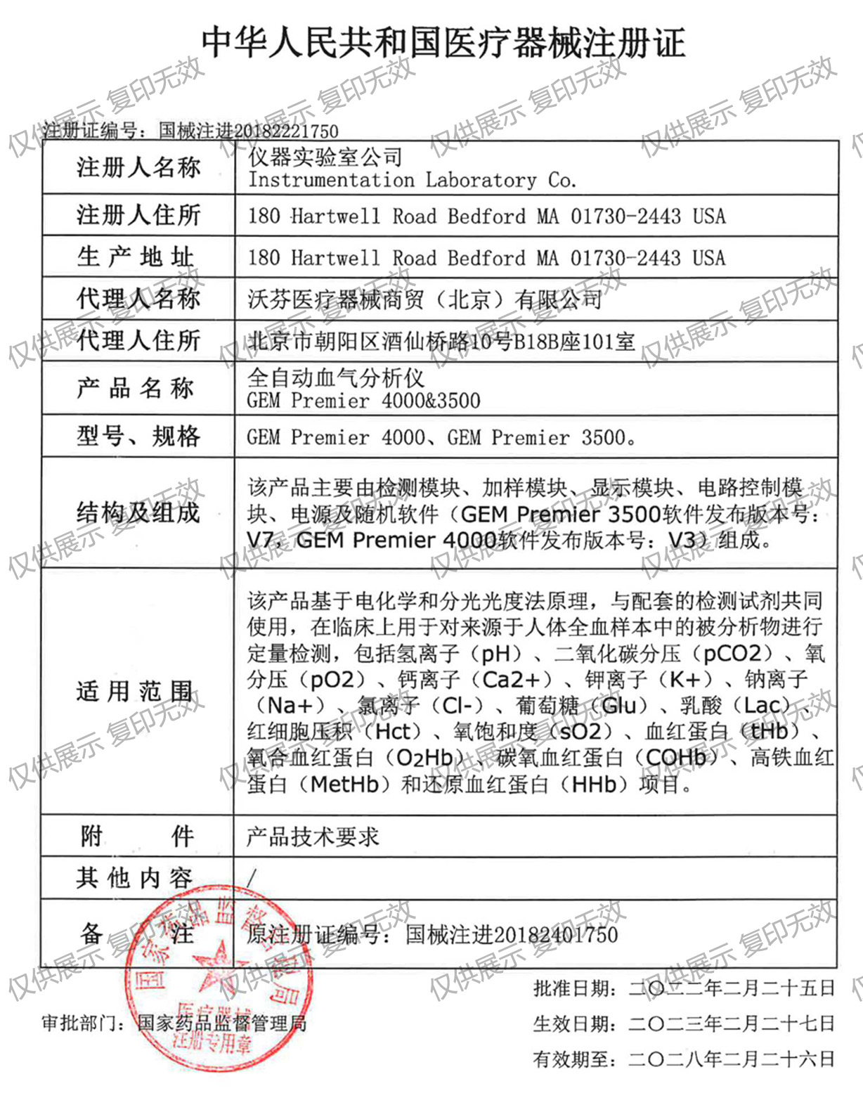 適用范圍:該產(chǎn)品基于電化學和分光光度法原理,與配套的檢測試劑共同使用,在臨床上用于對來源于人體全血樣本中的被分析物進行定量檢測,包括氫離子(pH)、二氧化碳分壓(pCO2)、氧分壓(pO2)、鈣離子(Ca2+)、鉀離子(K+)、鈉離子(Na+)、氯離子(Cl-)、葡萄糖(Glu)、乳酸(Lac)、紅細胞壓積(Hct)、氧飽和度(sO2)、血紅蛋白(tHb)、氧合血紅蛋白(O2Hb)、碳氧血紅蛋白(COHb)、高鐵血紅蛋白(MetHb)和還原血紅蛋白(HHb)項目。